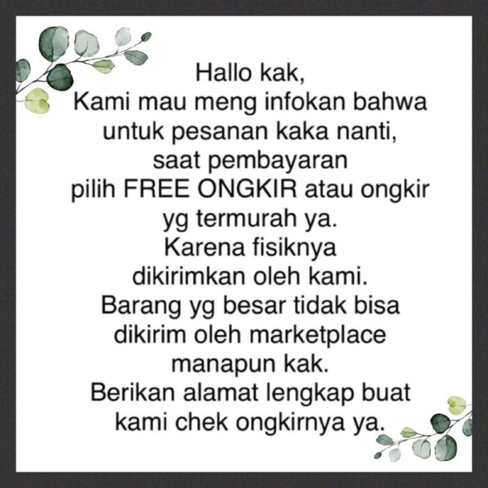 Sangat di harapkan alamat yang lengkap dan jelas ( bila perlu ada patokan lokasinya untuk memudahkan pengiriman ) dan sertakan juga nomor HP aktif penerima supaya pemesan tidak terganggu oleh kurir yg menelpon untuk menanyakan alamat.